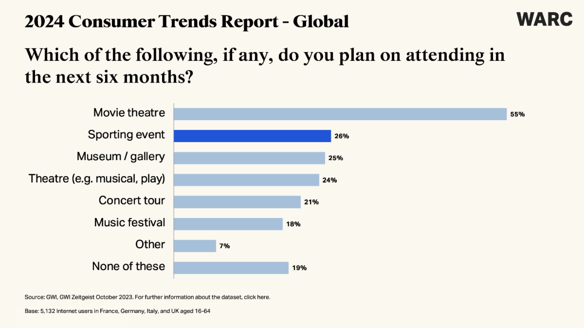 Live evenementen stimuleren ook de consumptie in andere branches. Volgens GWI kocht tweederde van de consumenten die een concerttournee, muziekfestival of sportevenement bijwoonden eten en drinken, en reisde bijna de helft van de concertbezoekers voor het evenement. Marketeers kunnen hier volgens Warc op reageren door te zorgen voor een goede match in evenementenpartnerschappen.