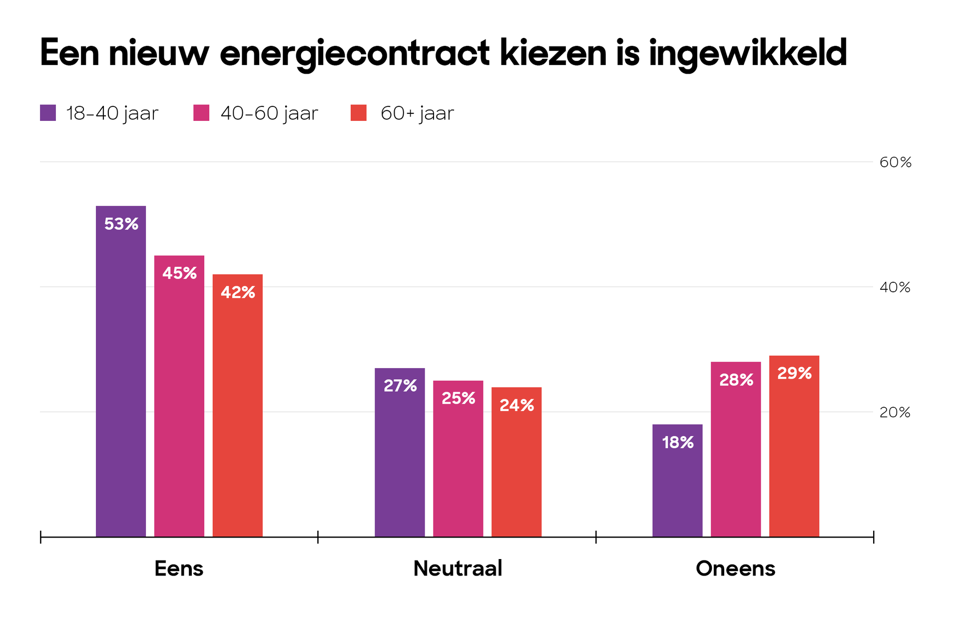 Uit onderzoek van DPG Media en Panel Inzicht blijkt dat bijna de helft van de Nederlanders (47%) het kiezen van een nieuw energiecontract ingewikkeld vindt. Vooral de jongere doelgroep tussen de 18 en 40 jaar worstelt met het maken van de juiste keuze: de helft van hen zegt hulp nodig te hebben bij het kiezen van een passend contract.