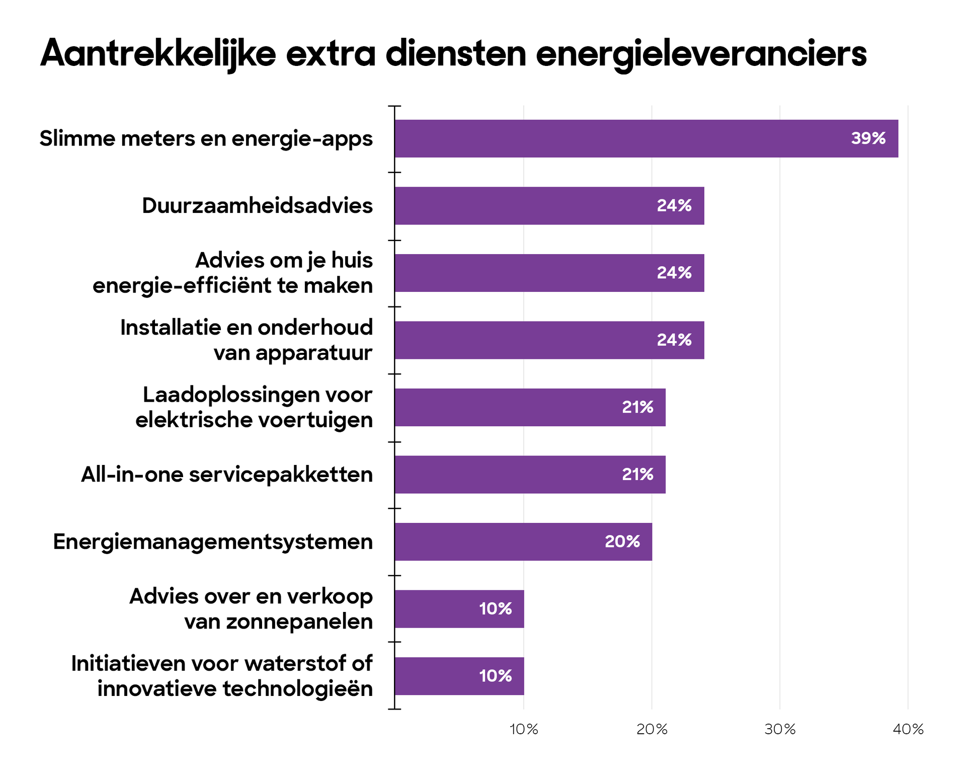 De belangrijkste factoren bij het kiezen van een energieleverancier zijn kosten, betrouwbaarheid en transparantie over tarieven en voorwaarden. Naast transparantie verwachten consumenten steeds vaker extra diensten van hun energieleverancier. Slimme meters en energieapps, duurzaamheidsadvies en advies om je huis energie-efficiënt te maken worden als de meest aantrekkelijke extra diensten gezien.