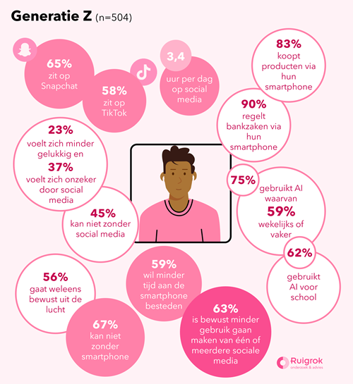 Uit het onderzoek What’s Happening Online 2025 (WHO) van onderzoeksbureau Ruigrok blijkt dat jongeren minder tijd op hun telefoon willen besteden, maar het lastig vinden om écht offline te zijn. Tegelijkertijd kunnen ze social media nauwelijks missen. Het rapport laat zien dat vooral jongere generaties worstelen met hun online gedrag en de impact daarvan op hun mentale gezondheid. ‘Veel jongeren willen wel minderen, maar vinden het moeilijk om de balans te vinden’, zegt Julie Frommé, research consultant bij Ruigrok. ‘Ze zijn zich bewust van de negatieve impact, maar ze zijn ook erg gehecht aan hun online leven. Dat maakt het een boeiend én actueel thema.’