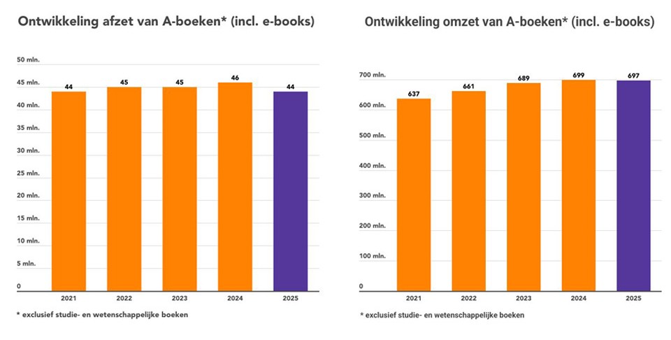 In totaal werden vorig jaar ruim 44 miljoen boeken verkocht, met een gezamenlijke omzet van ongeveer 697 miljoen euro. Dat is iets minder dan het uitzonderlijk goede jaar 2024, waarin bijna 46 miljoen boeken over de toonbank gingen. De gemiddelde boekprijs steeg met 3 procent, waardoor de omzet vrijwel op peil bleef . Het fysieke verkoopkanaal leverde in op volume, terwijl online verkoop stabiel bleef.