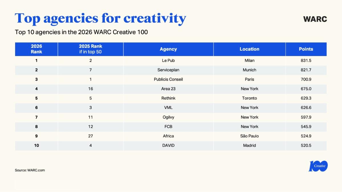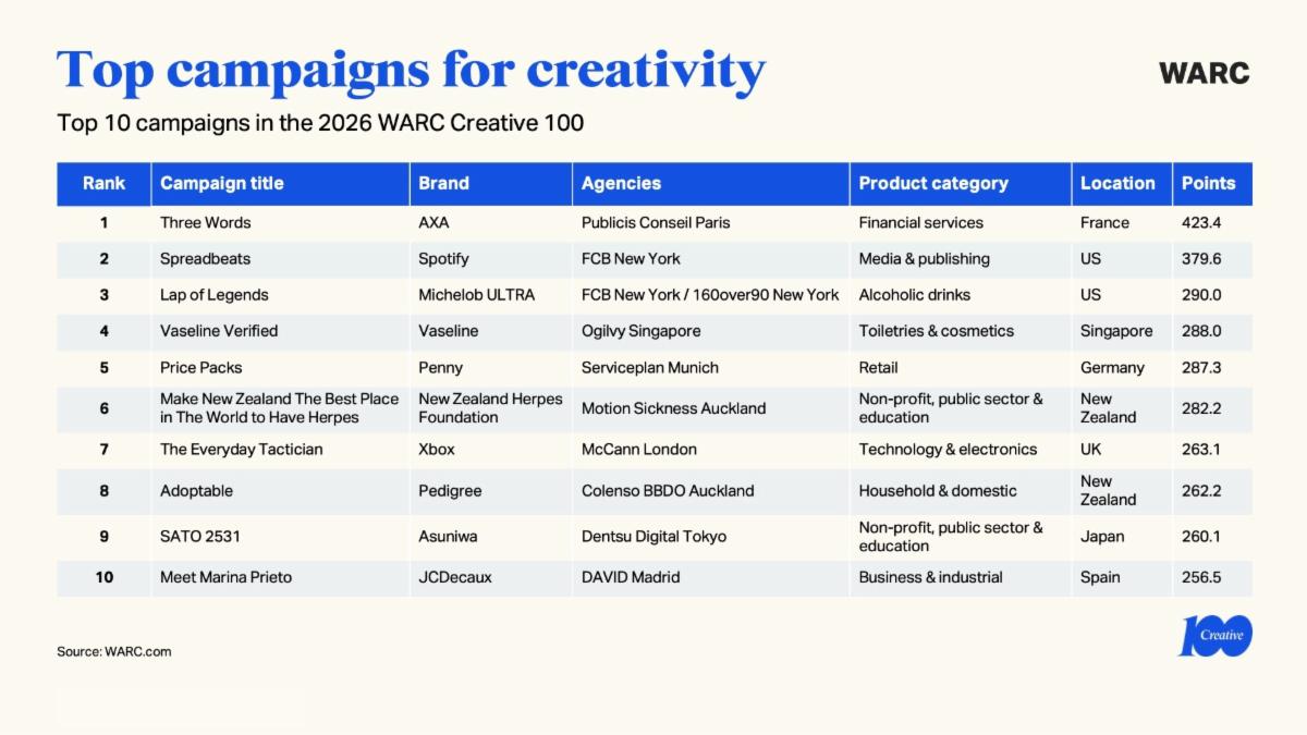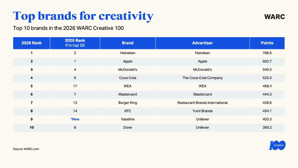 De WARC Creative 100 geldt als een van de belangrijkste internationale benchmarks voor creativiteit in marketing en reclame. De ranking bundelt de resultaten van de grootste wereldwijde en regionale creatieve awards van het afgelopen jaar. Volgens Amy Rodgers, Head of Content bij WARC Creative, laat de lijst zien hoe creativiteit het verschil maakt in een steeds competitiever marketinglandschap. ‘De WARC Creative 100 viert de campagnes en bedrijven die de toekomst van marketing vormgeven door creativiteit in te zetten als motor voor onderscheid en verandering.’
