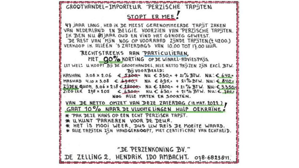 De Perzenkoning plaatste jarenlang handgeschreven advertenties in kranten waarin hij telkens aankondigde dat hij ‘ermee stopt’. In 2026 is het echt definitief, omdat zijn pand in Hendrik Ido Ambacht moet worden verlaten. Zijn advertenties waren een marketingfenomeen: opvallend, persoonlijk en herkenbaar.
