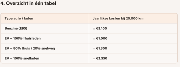 In alle gevallen is elektrisch rijden altijd economisch voordeliger voor wat betreft de brandstofkosten dan een benzineauto in dezelfde prijsklasse. Maar je dient er ook rekening mee te houden dat de afschrijving van EV’s hoger is door de snelle technologische veroudering (nieuwe modellen met grotere range). Onzekerheid over batterijconditie en veel zakelijke EV’s komen tegelijk op de markt wat prijsdruk geeft.