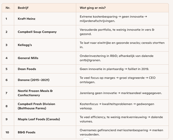 Zoals Kraft Heinz zijn er vele grote Amerikaanse levensmiddelenconcerns die langdurig en zwaar hebben ingezet op kostenbesparingen en erdoor in de problemen zijn gekomen. Deze bedrijven verloren marktaandeel, waarde of strategische richting doordat ze te veel sneden en te weinig investeerden in innovatie, duurzaamheid en merkbouw.