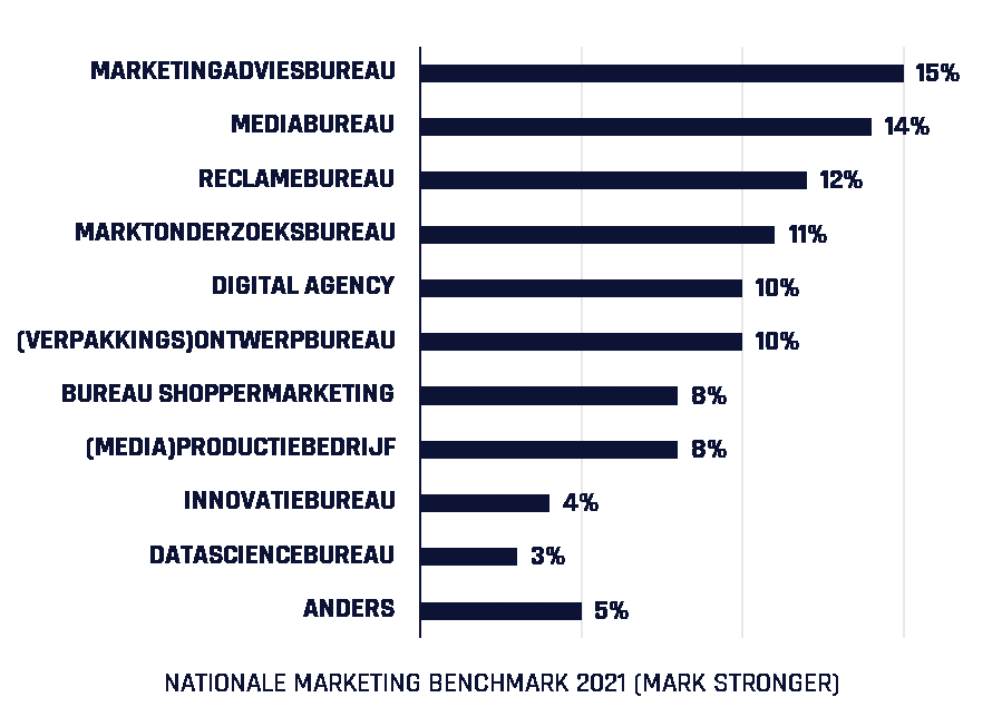Welk bureau de regiefunctie krijgt van marketeers is niet op voorhand te zeggen. Er is geen duidelijke winnaar. Marketing- en mediabureaus voeren de ranglijst weliswaar aan, maar reclame-, onderzoek- en ontwerpbureaus en digital agencies worden bijna even vaak genoemd. Volgens Jansen weerspiegelt dit de enorme complexiteit waar marketeers tegenwoordig mee te maken hebben. ‘Marketing is steeds specialistischer geworden en elk specialisme claimt zijn eigen gelijk. Dat speelt ook binnen marketingteams en -afdelingen. Op zich is daar niets mis mee. Spitsen moeten als de beste kunnen scoren en keepers als beste ballen kunnen tegenhouden. Maar specialisten overzien het geheel niet.’