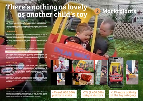 De bij de twee Nederlandse winnaars betrokken bureaus Happiness Amsterdam en Fitzroy werden beiden onderscheiden tijdens de awardshow vanavond. Happiness Amsterdam won naast 'Silver' in Integrated Campaigns for Commercial Brands ook de ADCE Green Star Award met 'Nothing as lovely as another child's toy' voor Marktplaats. Hieronder het case-sheet. De prijs wordt toegekend aan werk dat bijdraagt aan duurzaamheid, circulariteit en milieubewustzijn.