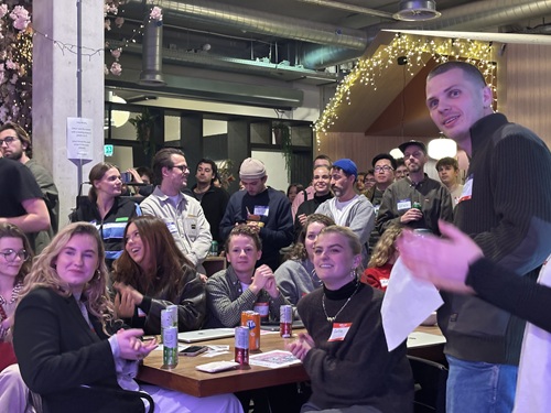 De zaal van Dentsu op de Moermanskkade zat bomvol met zo'n 50 creative directors en 150 jonge creatieven die de Zaagwinnaar wilden zien en daarna hun portfolio wilden bespreken met de aanwezige creatieve bureaubazen, in een speeddate opzet.