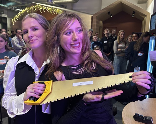 Op bovenstaande foto schoven twee eerdere Zaagwinnaars van Dentsu aan: niemand minder dan Gijs Sluijters, in 2024 nog goed voor een Grand Prix in Cannes met Joris Tol (voor KPN - 'Piece of me') . En Leendert-Jan de Ronde die met Luuk Simonse in 2019 de Zaag mocht ophalen. Reden voor de jury om een speciale banketletter met de S van 'Saw' uit te reiken namens de Golden Saw-community voor exceptionele prestaties door Dentsu Creative Amsterdam. Winnaressen Esther van Vliet & Steffi Boom worden verder omringd door de eindjury, co founders Indie, MarketingTribune en de Jonge Honden / Young Dogs board.