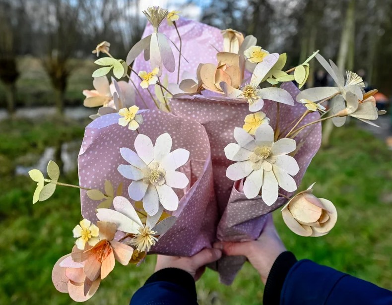 Voor Böhmer komt die stap op het juiste moment. ‘Het idee is er vaak wel. Ik ben creatief genoeg om dingen te maken, maar hoe breng je het verder? Soms heb je een gelukje of een kans, maar het gaat over veel meer. Over bloemen die niet goed zijn qua teelt, over gifstoffen. Grasboeketten zijn een mooi alternatief. Het moet normaal worden dat je niet per se verse bloemen geeft.’ Grasboeket maakt papieren bloemen van bermgras uit ecologisch beheerde bermen. Het gras wordt via papierproducent Waardewenders verwerkt tot bermgraspapier. ‘Gemeenten beheren hun bermen ecologisch, met een speciaal maaiplan. Dat wordt verwerkt tot papier. Zo kun je dus in je eigen gemeente een circulair verhaal maken: je printpapier, maar ook mijn bloemen, komen letterlijk uit je eigen berm.’ De vraag naar een alternatief voor bespoten bloemen stijgt, merkt Böhmer in de praktijk. ‘Gemeenten willen bijvoorbeeld wel iets duurzaams, maar weten niet zo goed wat dan. En kunstbloemen zijn vaak ook plastic. Zelfs zijde is niet zo fantastisch als mensen denken.’ Haar bloemen en boeketten worden met de hand gemaakt, samen met mensen van een dagbesteding. ‘Dus elke stap in het proces is maatschappelijk en duurzaam’, vat ze samen.