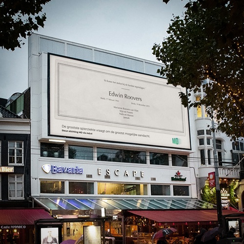Wat normaal een klein berichtje in de krant is, verschijnt deze week op de grootste billboards van Nederland. Met uitvergrote rouwadvertenties vraagt Stichting MD aandacht voor Myotone Dystrofie (MD), een dodelijke en erfelijke spierziekte die bij het grote publiek nog relatief onbekend is.