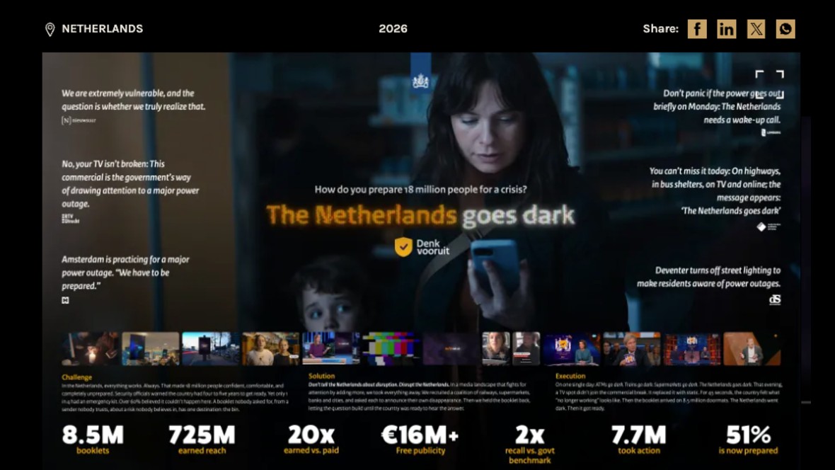 Centraal stond een indringend toekomstscenario waarin Nederland grootschalig uitvalt. De campagne moest burgers bewust maken van hun eigen voorbereiding op noodsituaties, zoals 72 uur zonder stroom, water of internet. Volgens de organisatie prees de jury de brede herkenbaarheid van het scenario en de duidelijke maatschappelijke relevantie. Daarmee wist de campagne zich te onderscheiden in een internationaal speelveld waarin jaarlijks tienduizenden inzendingen uit meer dan zeventig landen meedingen naar een Clio.