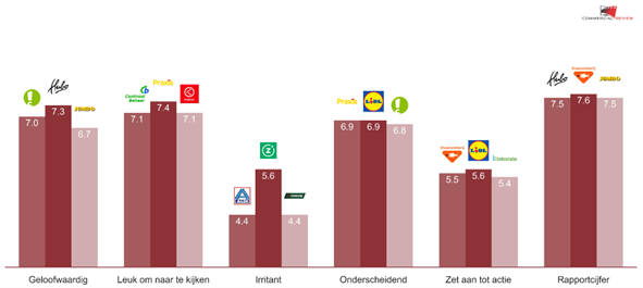 In de categorie Zet aan tot actie scoort Lidl het hoogst (5,6), gevolgd door Staatsloterij (5,5) en Intratuin (5,4). Intratuin doet dit met de commercial Ruik de lente, in samenwerking met Persuade Brand Interaction, waarin beleving en seizoen centraal staan. Balfoort: ‘Respondenten geven aan dat de commercial aanzet tot bezoekintentie: “Je krijgt er echt zin van om naar de winkel te gaan en iets met je tuin te doen, het maakt het seizoen heel tastbaar.” Dit laat zien dat activatie ook via emotie kan werken.’