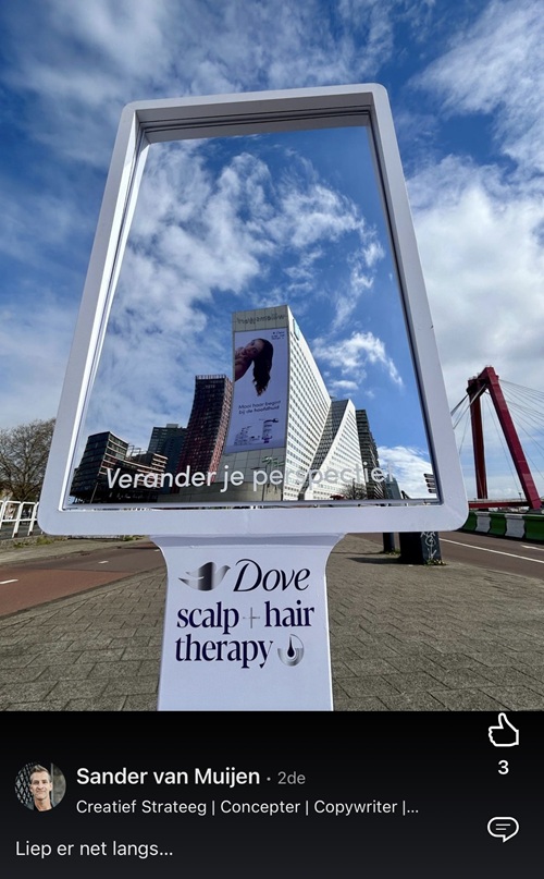 Wat in eerste instantie leek op een opvallende drukfout, blijkt een doordachte zet van Dove. Afgelopen weekend verscheen op de Willemswerf in Rotterdam een spiegelbeeldige advertentie met model en merkambassadeur Joann van den Herik. De ogenschijnlijke ‘misprint’ leidde direct tot discussie, zowel op straat als online.