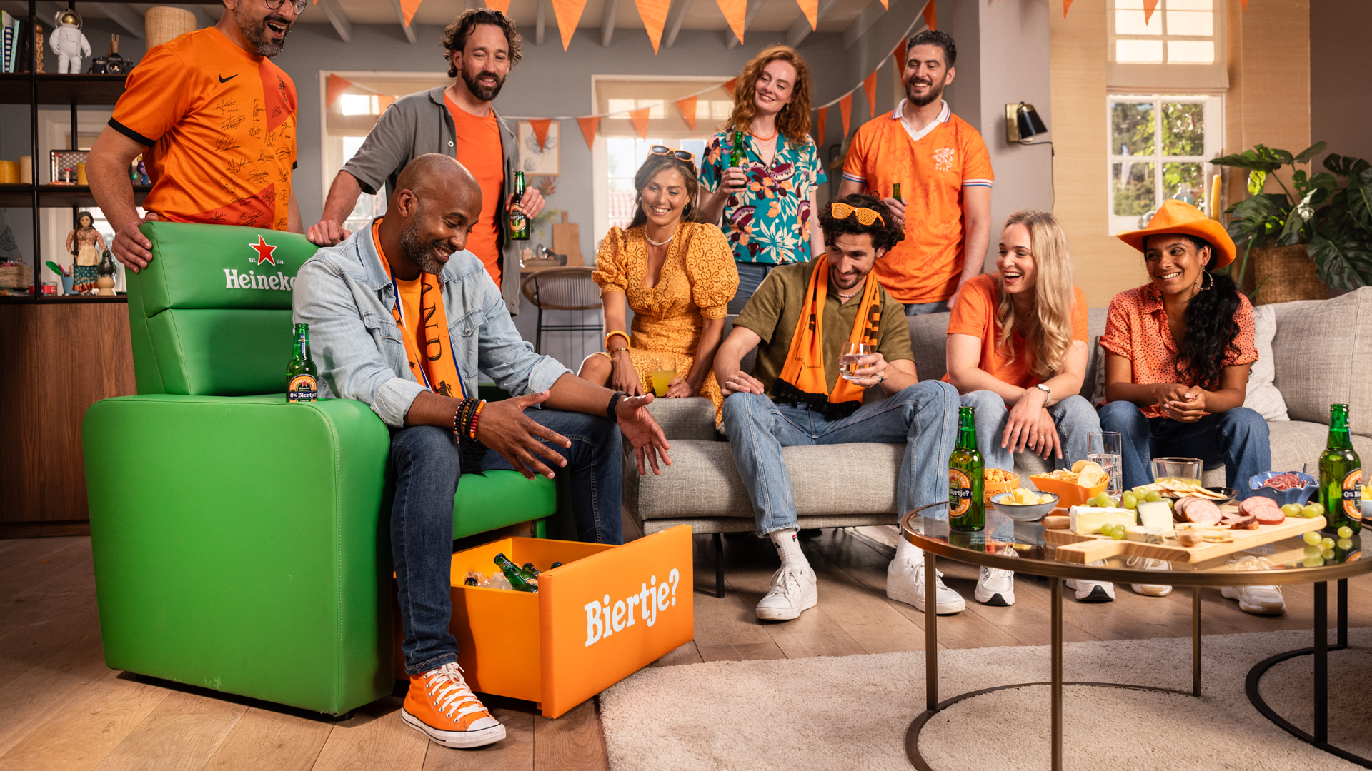 Het biermerk voorziet 3.000 cafés van oranje promotiepakketten. Heineken horecazaken en hun barpersoneel worden in oranjesferen gebracht zodat het daar volgens Heineken een feest is om met elkaar naar de wedstrijden te kijken en samen te proosten op de prestaties van het Nederlandse team. Ook voor Oranjefans die liever thuis de prestaties van het Nederlands Elftal volgen zit er veel moois in het vat. In 1.800 supermarkten maken voetballiefhebbers bij aanschaf van een Heineken product kans op prijzen waarmee de prestaties van het Nederlands Elftal nog beter beleefd kunnen worden. Voetbalfans die bij Albert Heijn boodschappen doen hoeven geen doelpunt te missen dankzij de Stoelbox. De Stoelbox is middelpunt in een online campagne samen met Albert Heijn en kan naast online ook gewonnen worden in diverse filialen waar de Stoelbox fysiek te bewonderen is. Shop je liever bij de Jumbo, dan maak je kans op het Heineken Biermertje. Met een grote groep samen een wedstrijd van ‘Ons Oranje’ kijken op een té klein scherm is verleden tijd, want dankzij een beamer in de vorm van een Heineken krat zie je zo met gemak alle hoeken van het veld. Bij Plus maken fans kans op het Heerlijk Helder Speakertje in de vorm van een Heineken blikje.