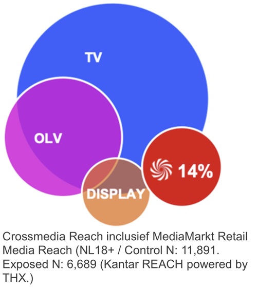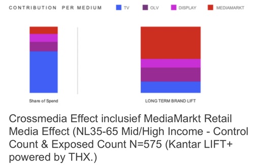 Uit de zogenoemde 'Lift+ powered by THX'.-meting van Kantar blijkt dat de combinatie van total video (TV/OLV) en MediaMarkt retailmedia zorgde voor een sterke uplift van +33% op kortetermijn KPI’s en +18% op lange-termijn Brand KPI’s. 'Daarmee wordt de rol van retail-touchpoints binnen de mediamix opnieuw bevestigd', aldus de researchers.