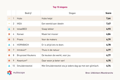 Op de tweede plaats in het onderzoek staat Ikea met de slogan ‘Een wereld aan ideeën’ (7,47). In de top vijf domineren slogans die consumenten aansporen om zelf creatief aan de slag te gaan. Voorbeelden hiervan zijn ‘Maak het mooier’ van Karwei en ‘Er is altijd iets te doen’ van Hornbach. Dit type slogan weet consumenten niet alleen te inspireren, maar ook te activeren.