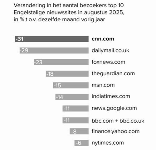 In Engelstalige markten zijn de gevolgen al zichtbaar. Volgens Press Gazette daalde het verkeer naar de vijftig grootste nieuwssites tussen augustus 2024 en augustus 2025 fors: Forbes.com verloor 53% bezoekers, Washingtonpost.com 41% en CNN.com 31%. Alleen Substack noteerde groei. Hoewel ook sociale media hun nieuwsaanbod temperen, wijzen veel mediabedrijven vooral naar Google’s AI-functies als oorzaak.