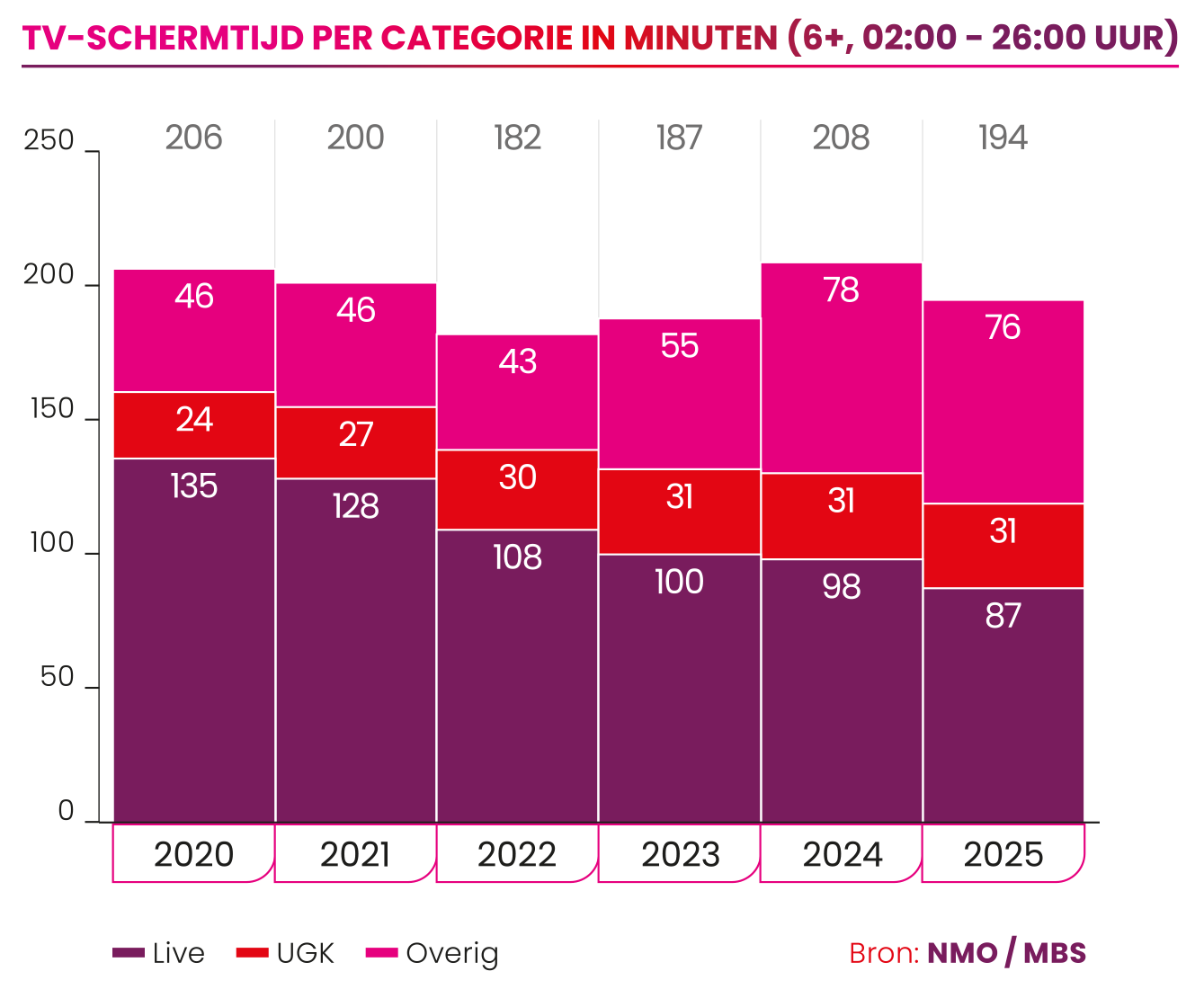 De gemiddelde kijktijd naar live en uitgesteld kijken daalde naar 118 minuten per dag (-9%). Toch blijft premium content bereik genereren. De finale van het Eurovisie Songfestival was met 3,6 miljoen kijkers het best bekeken programma van 2025.