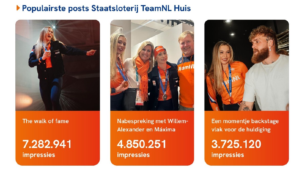 De cijfers laten zien dat de emotionele en vaak informele momenten rondom de Spelen online minstens zo goed werken als de sportprestaties zelf. De best scorende posts op de TeamNL-kanalen waren die rond de gouden race van Jutta Leerdam, het ontvangst van de olympische ploeg in het Nederlandse luchtruim door een straaljager van de luchtmacht en een luchtiger moment: de friet die het Koninklijk Huis liet serveren op verzoek van schaatser Jorrit Bergsma.