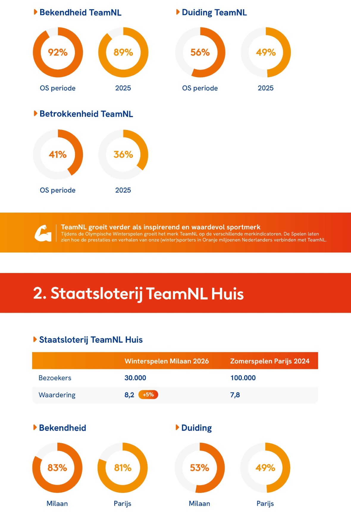 Ook het Staatsloterij TeamNL Huis noteerde tijdens de Winterspelen een stevige groei. Dat platform realiseerde 80,5 miljoen impressies en 2,7 miljoen interacties, tegenover respectievelijk 21,3 miljoen en 800 duizend tijdens Parijs 2024. Daarmee onderstreept NOC*NSF opnieuw de waarde van het TeamNL-platform als mediamerk rond grote sportevenementen, niet alleen voor fans en sporters, maar ook voor partners die meeliften op de collectieve aandacht.